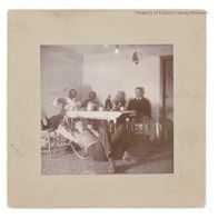 Update 2008: Black and white print. Snapshot. Mounted on patterned light grey matboard. Image of 5 men seated at and lounging in front of a table. Men casually dressed. Man at left is pretending to drink from metal teakettle. Man in foreground lying against an overturned chair. Bare bulb and bird in ring cutout hanging from ceiling.