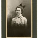 Update- 2009: Black & white print. Studio portrait. Mounted on dark green & white matboard. Half length portrait of a young woman. She is wearing a long sleeved, light colored patterned dress with vertical ruffles at each side of bodice. Dark ribbon tie at neck; high white collar. Her hair is pinned up with a large dark bow. Painted backdrop behind.