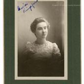 Update - 2009: Black & white print. Studio portrait. Mounted on green & white matboard. Head & shoulders portrait of a young woman wearing a light-colored dress with square puffed neckline. Lace overlay & circular ribbon decoration on bodice yoke. Her hair is pinned up. Painted backdrop behind.