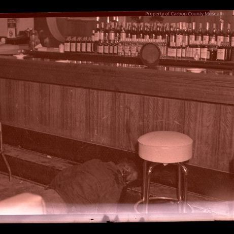 B&W of a bar, two bar stools and a man laying on a bar step, face down in a pool of blood, May 9, 1957, Rawlins.