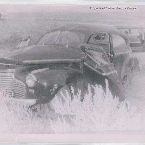 update 2009: Black and white print. Image of a wrecked automobile on the prairie. automobile at background right with man running toward wrecked care. Another automobile in background at left.