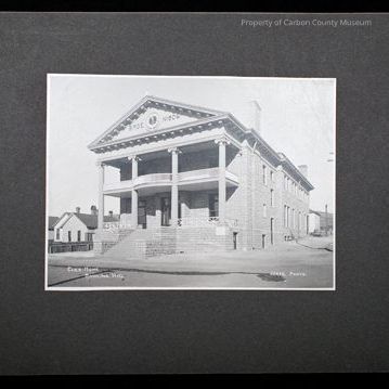 Update 2009: Black and white print mounted on gray matboard .Image of a multi-story stone building with a two story porch on front, short side tipped with a decorated pediment. Raised foundation at front of building with steps leading to porch and entrance. Two stone chimney's on right side roofline. Inside pediment" "B.P.O.E." [clock at 11:00] "No 609." Houses in background; dirt road in foreground and along right side.