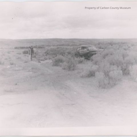 Update 2009: Black and white image. Image of the remains of an automobile accident on a sagebrush prairie. Two men are standing near a blanket draped body just left of center. Image fuzzy.