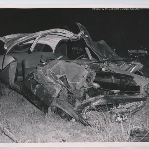 B&W of a car crash, WY License plate 4-6114 at night, two cars appear in the background. Notation on back: Angelo Barrera, 16 miles west Rawlins, Nov. 11, 1957, killed.