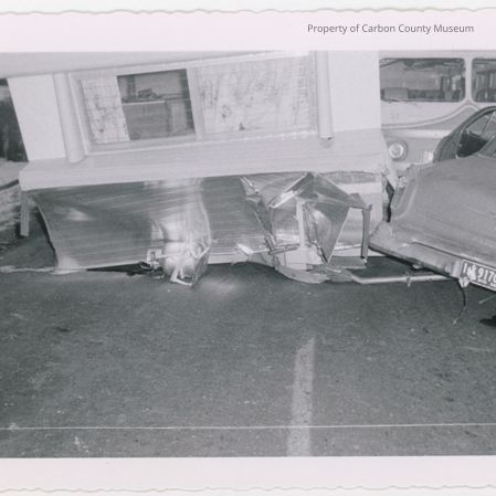 Update 2009: Black & white print. Snapshot. Image of an accident involving a housetrailer, car & a bus. Car license "10917C" "58" Wyoming. Scalloped edge on border.