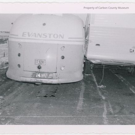 Black & white print. Image of an accident involving a bus & a house trailer - side by side. Evanston bus with 2 license plates - "PSC T 9281" "57"; WYO "19 1657" "58".