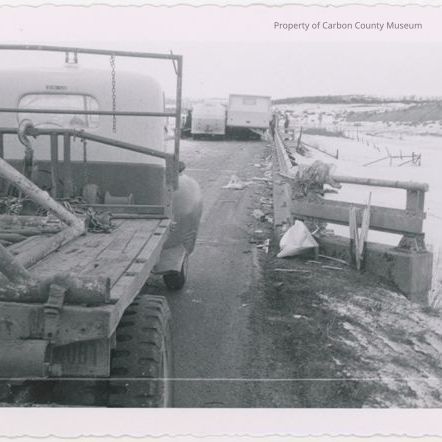 Update 2009: Black & white print. Image of an accident between a bus and housetrailer on a bridge. Wrecker in foreground. Snow-covered fields & hills at right background. Scalloped edge on border.