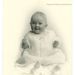 Update 2009: Black and white studio portrait. Full length portrait of a seated baby wearing a long lace-trimmed light dress and light two-colored knit booties.