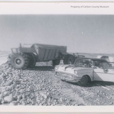 Update 2009: Black & white print. Image of a wrecked earthmover with a law enforcement car in foreground, view 2. Door & trunk of car open.