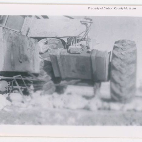 Update 2009: Black & white print. Image of a wrecked earthmover - close-up of jackknife & wheel.