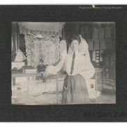 Update 1/2010: Black and white print. Snapshot. Mounted on dark grey matboard with floral border. Image of a young woman standing with her right arm leaning on a display case of lace. She is wearing a dark skirt, white blouse and tie; her hair is pinned up. Other display cases and shirt and collar display in background. Taken inside a clothing or general store.