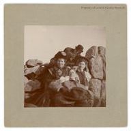 Update 1/2010: Sepia print. Snapshot. Mounted on tan matboard with floral border and indented frame around image. Image of two men and two women seated on a rock formation. Women are in dresses and hats. Men are in suits. One man is lying in the women's laps in foreground. Second man is lying behind the women with his hands blocking his face.