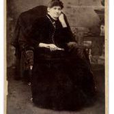 Update 1/2010: Black and white print. Cabinet card. Studio portrait . Mounted on tan matboard. Full-length portrait of a woman seated in a fabric-draped chair in front of a painted scenic backdrop. Woman is wearing a dark dress with buttons down the bodice front and light colored lace collar. Her left hand is propped under her left cheek and she is holding a book up in her lap with her right hand. Her hair is pinned up and curly in front. Printed on lower margin in black ink: "W. A. Bradley, Union Pacific Photo Car."