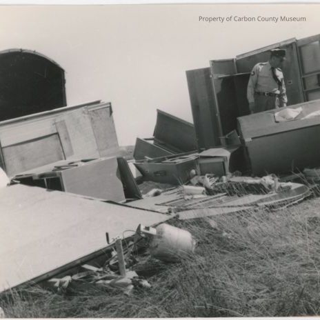 B&W photo of a scene of wrecked house trailer, two officers and debris of wrecked trailer.