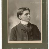 Update 2009: Black and white studio portrait. Mounted on green and white matboard. head and shoulders portrait of a young man dressed in dark 3-piece suit, white shirt with high starched collar and dark tie. He is looking to the viewer's right. Dark hair is parted in the middle.