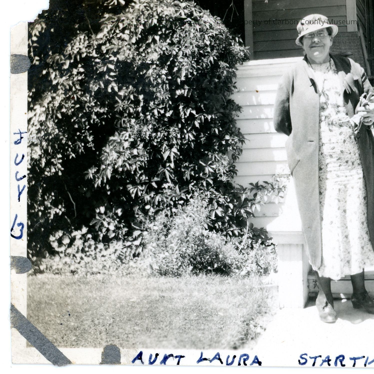 Black and white photograph. A woman is standing beside a set of concrete stairs that lead to a house. Written along the top edge of the photograph is "RAWLINS", written along the bottom edge is "AUNT LAURA STARTING TO WORK", written vertically along the left edge is "JULY 13", and written vertically along the right edge is "1934". Written on the reverse is "Laura Huntington Heath", the number 638 is also printed on the reverse.Collection