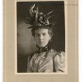Update - 2009: Black & white print. Studio portrait. Mounted on light green & white matboard with patterned border. Head & shoulders portrait of a woman wearing a horizontally pleated dress/blouse with high sequined dark collar. She is wearing a flat-brimmed hat with large ribbon bow & feathers. Her hair is pinned up. Painted background behind.