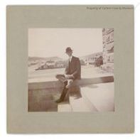 Update - 2009: Black & white print. Snapshot. Mounted on light grey-green matboard with vine design border. Image of a man seated on side of stone stairs with his right ankle resting on his left knee. His hands are clasped in his lap. He is dressed in a dark three-piece suit, white shirt, tie, hat & boots. Open space & buildings in background with hills beyond. Wall of stone building at right.