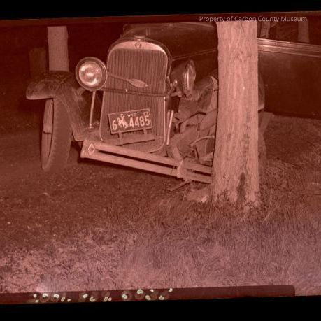 Update - 2009: Black & white negative. Image of a vintage automobile that appears to have been run into a tree. Driver's door open & driver's side front fender & wheel smashed on tree.