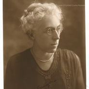 Update 1/2010: Sepia print. Studio portrait. Head and shoulders portrait of a woman in a dark gauzy dress with beaded accents. She is wearing a single strand of pearls and oval wire rimmed glasses. Her light hair is pinned up. She is looking to the viewer's right. Painted backdrop behind. Embossed in lower right corner:"Nast. Denver".