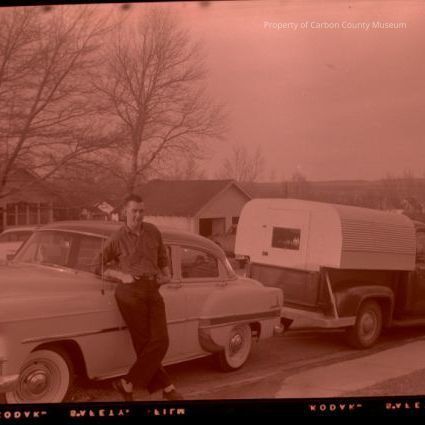 2. Image of a man leaning against a car that has been backed up to the back of a pickup truck with a camper shell. Houses & trees in the background.Collection
