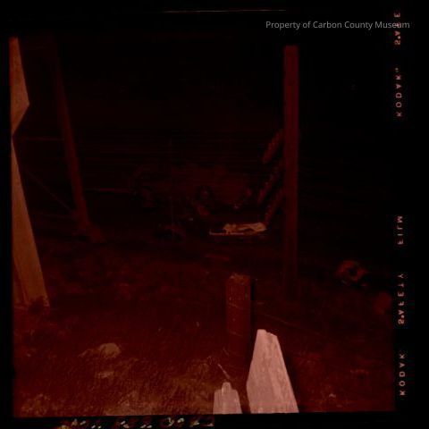 Update - 2009: Black & white print. Image of an automobile wreck from above. Car appears to have rolled down a hill and landed upsidedown on a railroad track. Guard rails or poles wrapped around vehicle. Guerney beside vehicle. Taken at right.