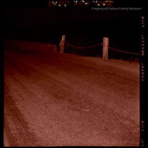 Update - 2009: Black & white print. Image of a dirt road & damaged guard rail post & wire. Taken at night.