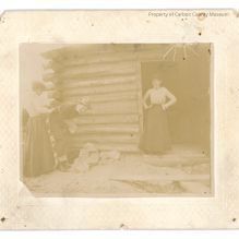 Update - 2009: Black & white print. Snapshot. Mounted on white matboard with patterned border. Image of three women laughing in front of a log cabin. One woman is standing in the doorway of the cabin with her hands on her hips; she is dressed in a dark skirt & light long-sleeved blouse & hat. Second woman at left is doing something with the back of the trousers of the third woman; she is dressed in a dark skirt & light long-sleeved blouse & hat. The third woman is dressed in jeans, a dark patterned shirt, & light hat, she is bending over to pick up (or put down) a bag from a pile at her feet.