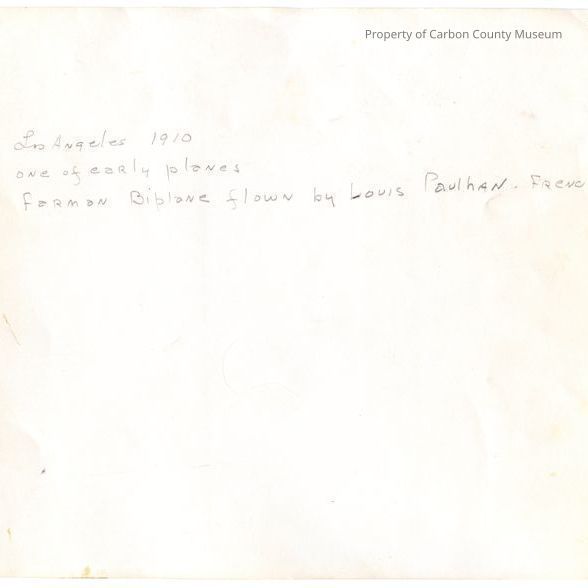 Written on back in pencil "Los Angeles 1910 on of early planes Faran Biplane Flown by Louis Paulhan-Frenchman"