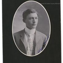 Update - 2009: Black & white print. Studio portrait. Mounted on black matboard. Oval head & shoulders portrait of a young man. He is dressed in a light suit coat, light patterned tie & white patterned shirt with high starched collar. His hair is short & combed back; he is clean shaven. Painted backdrop behind.