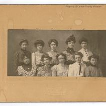 Update - 2009: Black & white print attached to ecru colored mat which has a linen look texture to border surface. Engraved script at mat lower center edge: Taylor Indiola, Iowa. Back mat surface is gray with black edges. Image is of a group of ten women, all with dark hair in bouffant type updos and wearing high collar vintage clothing. The women all in two rows with back row of five standing & front row of five seated. There are tiny black ink numbers above and below the women on mat edge which correspond to numbers & names on back of mat.