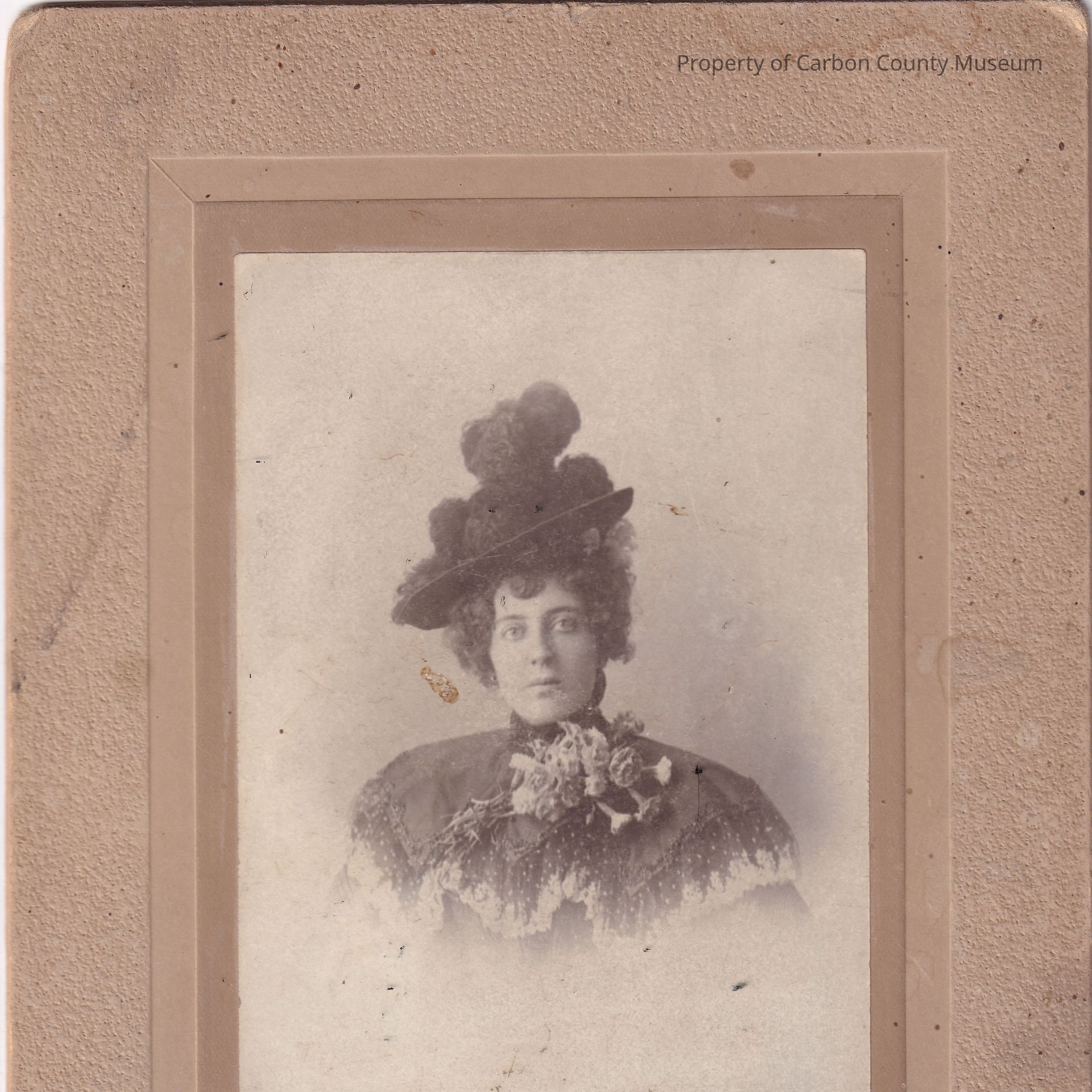 Cabinet card photograph with oversized card, black and white studio portrait of a young woman. Imprint on card reads "Brooks 928 - 16th St. Denver, Colo."