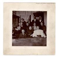 Update - 2009: Black & white print attached to ivory colored mat which has a textured outer border surrounding print. Image shows a group of men & women standing & sitting dressed in vintage clothing. They are in a living room with a window covered by a ruffled, long lace curtain behind them at center. A dark wood mirrored hall tree is seen on side right in background. Two young men & a girl on side left are "goofing off" pretending to choke each other and smiling. A woman in front row seated on side right is wearing an unusual poofy white lace accented long sleeved blouse.
