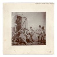 Update - 2009: Black & white print attached to ivory colored mat which has a textured border surrounding print. Image is of group of men dressed in cowboy type clothing & women dressed in vintage clothing standing on the steps of an open doored sheepwagon and to center and front side right of area. Person on side left of wagon tongue is wearing a light colored hard hat & holding a shovel. A man on far right is holding an extended large striped? paper in front of his torso allowing only his pant leg to show.