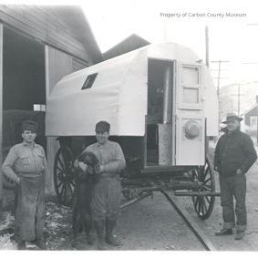 1919, sheepherders wagon and three unknown men.