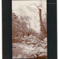 Update - 2009: Black & white print which has a maroon tone attached to a black mat. Image depicts a mountain stream with large rocks & boulders in streambed with a rocky wall on side left of stream, a tall dead tree at side right & a huge craggy mountain in background. two men are standing on rocks in distance at the center of the stream, each holding a vertical pole.