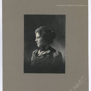 Update - 2009: Black & white print. Studio portrait mounted on grey matboard with black edge. Head & shoulders profile portrait of a young woman in a dark dress/blouse with velvet & white lace yolk & high collar. Her hair is pinned up with a velvet bow with an oval rhinestone decoration. She is wearing pence-nez eyeglasses.