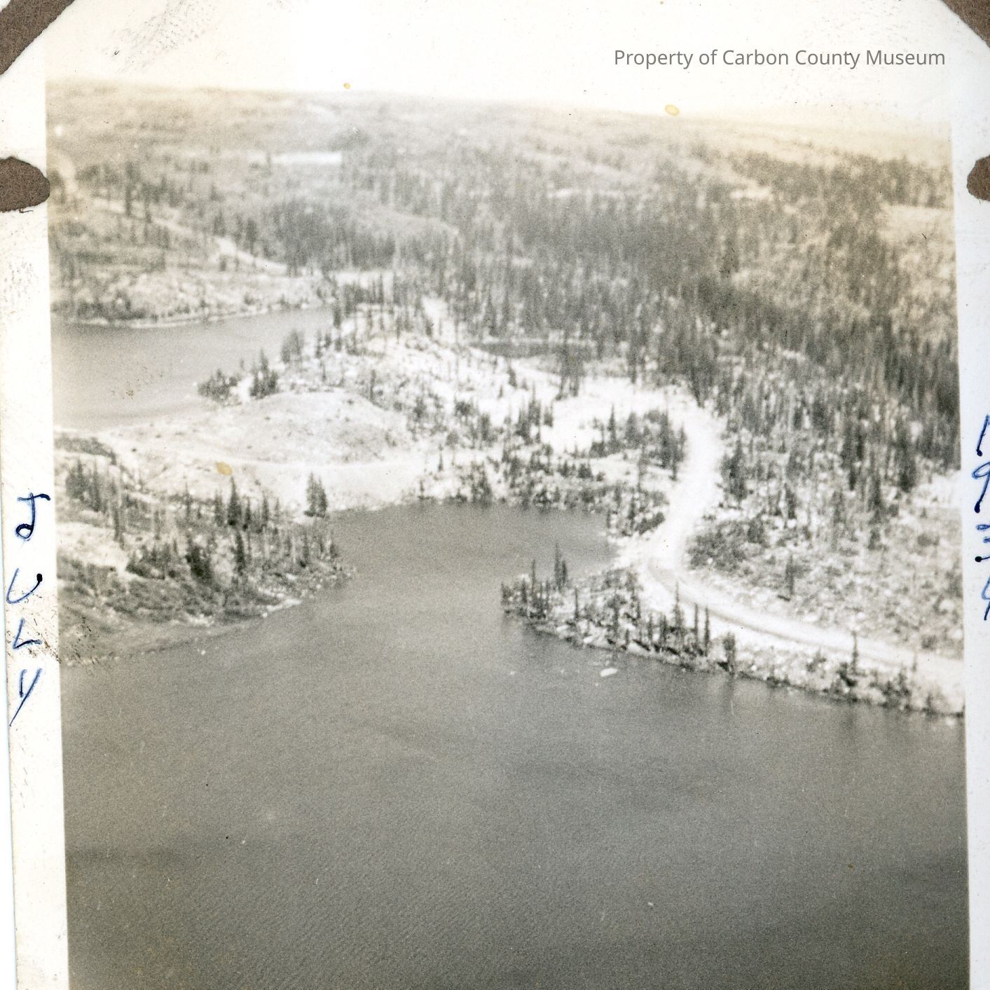 Small black and white photograph. A portion of a lake with some trees on its shore, a road follows along a portion of the lake. Written along the top edge of the photograph is "SNOWY RANGE", along the bottom "LAKE MARIE", vertically along the left "JULY", vertically along the right "1934". The number 193 is printed on the reverse.Collection