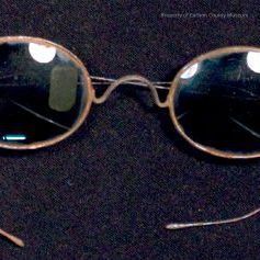 Silver, wire frames with green lenses Update 2014: silver colored metal (heavily rusted), bluish green lenses, sticker with "162" on proper right lense.
