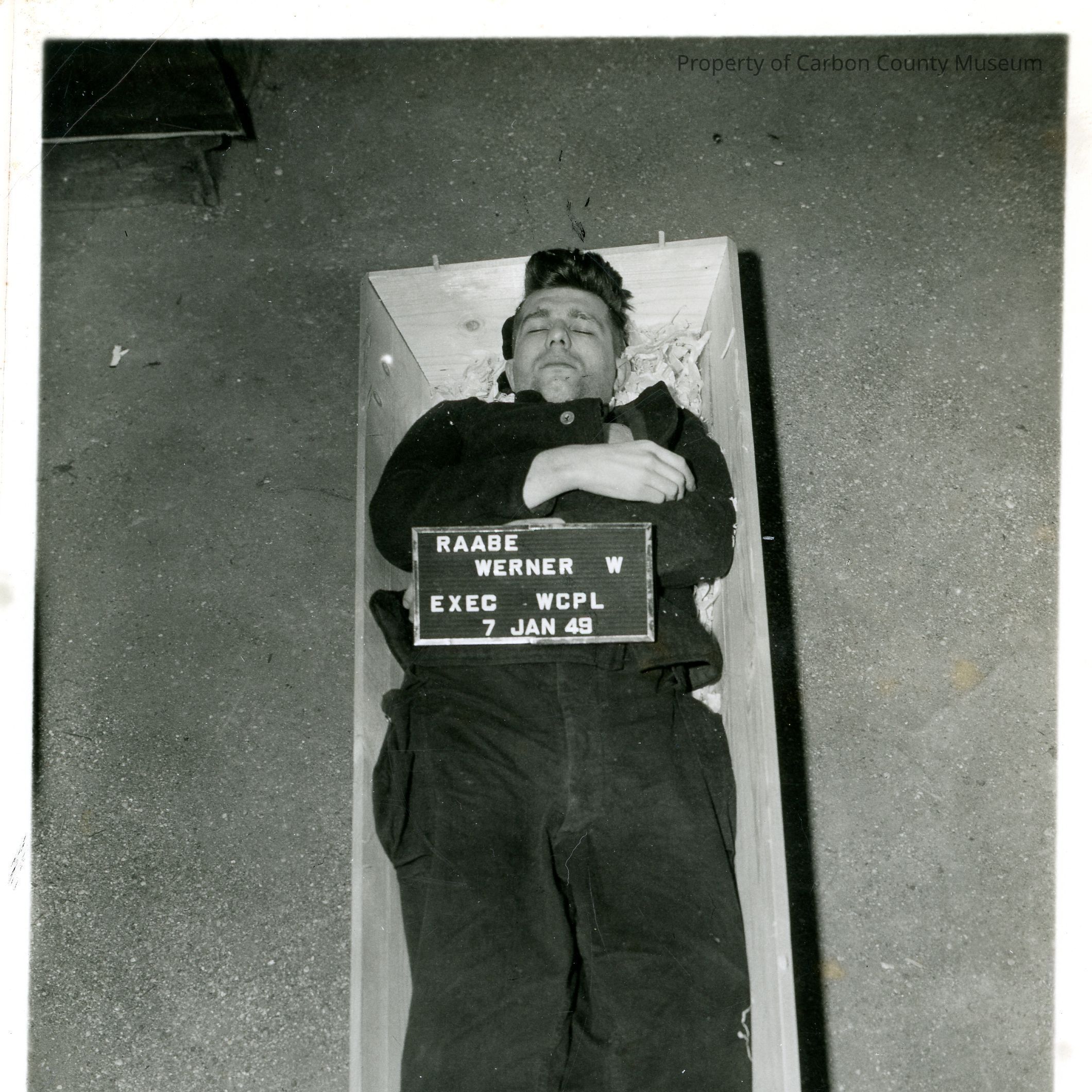 Black and white photograph of a man lying in a coffin. A placard on the man's chest reads "Raabe Werner W EXEC WCPL 7 Jan 49".