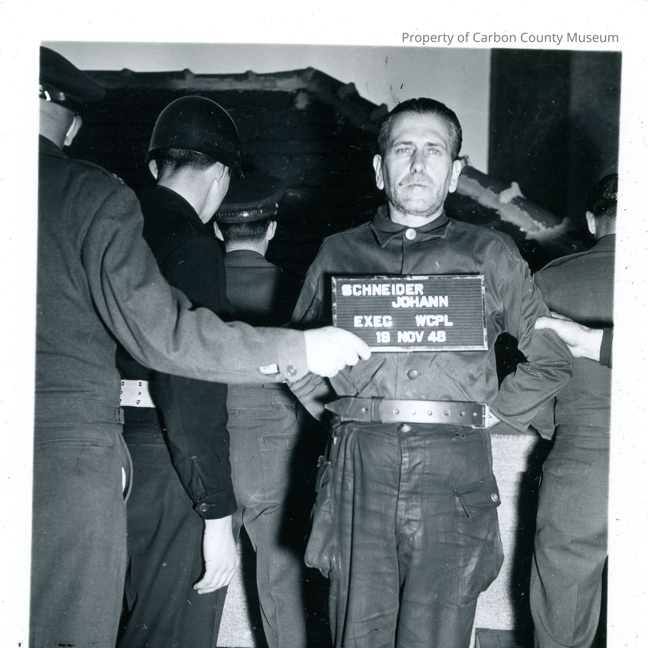 Black and white photograph of a man wearing a prisoner uniform, he is being held in place by a man wearing a military uniform facing away from the camera. The prisoner is also held by another man who is out of frame. Behind the three are two men in military uniforms with their backs to the camera. A placard held in front of the prisoner reads "Schneider Johann EXEC WCPL 19 NOV 48".