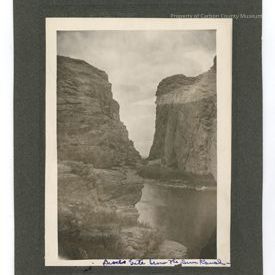 Update 2009: Black and white print mounted on dark grey matboard. Image of a river passing through a gap in a rocky cliff. Rocks and scrub brush in foreground. Scrub brush on banks of river.
