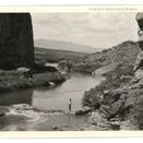 Update - 2009: Black & white print. Image of a river flowing through a rock walled canyon that opens to low hills in the background. Higher mountains in the far background. Man standing on rock at narrow spot in river; he is wearing dark pants, white shirt, dark tie & hat & is holding a fishing pole.