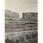 Update - 2009: Black & white print. Image of a gap in a rocky hillside with grassy fields & wood rail fences in mid and foreground.