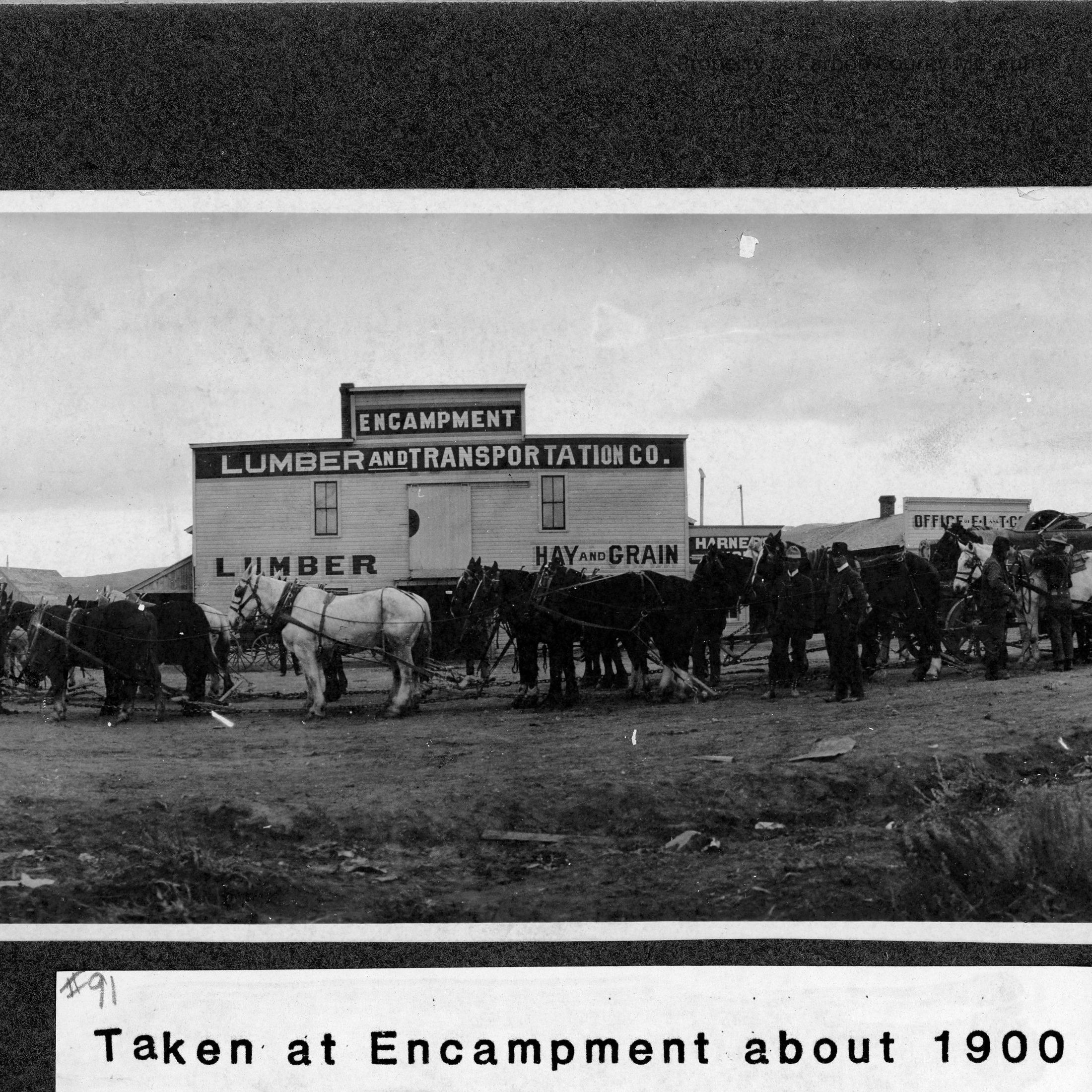 Update February 2011: Black & white print on black mat. Image of a clapboard building with a high dock. In front are multi horse & mule teams hitched to wagons that are heavily loaded. Men & a dog are on photo left & on right more men & a saddle horse. Building signs read "Encampment Lumber and Transportation Co, Lumber, Hay & Grain". Buildings in background signs: "Harners" "Office of E. L. & TCS". A few more scattered smaller buildings are on fringes of town.