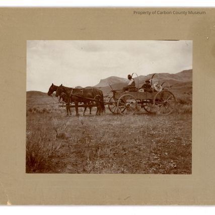 Update - March 2010: Black & white print on tan mat & one copy of wagon hitched with two horses. Buck board wagon has four ribs over open bed. One man seated on drivers seat & another man in wagon bed. A light colored rolled bundle is in wagon back. Foreground is grassy with tall hills in the background.