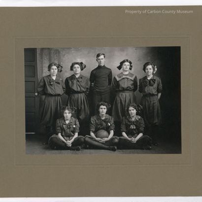 Update - March 2010: Black & white print on brown mat of girls basketball team. Four girls stand with one boy in the back row. Three girls are seated on the floor with the one in middle holding a basketball. Boy is standing in the middle & is wearing a black turtleneck & slacks. Girls are dressed in dark bloomers & blouses, most with a tie at the neck. Note: Writing on back is wrong in that it's identification is crossed out with a pencil. (Identified people in 1949.068.0161).