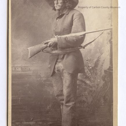 Update 2008: Sepia print mounted on tan stereocard. Studio portrait, full length. Image of a man dressed in jeans(?) suit coat and large wide brimmed hat. He has a long barrelled rifle butt out cradled in his left arm. He has long hair, short beard and mustache. Painted backdrop behind.