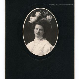 Update - 2009: Black & white print of well dressed lady. Print is mounted on black mat. Her head & shoulders in oval shape print are visible. Her dress is a light colored, high, lacy neck, V inset on front. It has lace from shoulders in veragated pattern down front, cap sleeves trimmed with lace above long sleeves. A long necklace with a watch is around her neck. She has a straw looking hat adorned with three roses with leaves above her dark upswept hair.