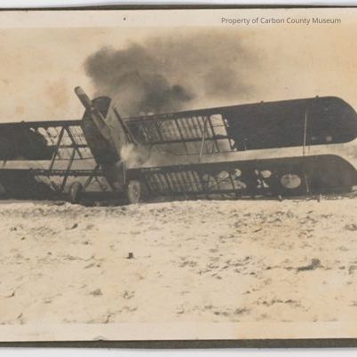 Update 1/2008: Black and white print. Snapshot. Image of a crashed and smoking bi-plane (two winged aircraft) in a snow-covered field. Partially adhered to a piece of gray photo album page.